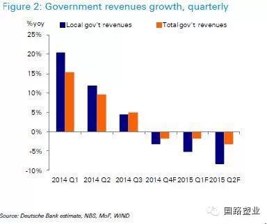 德意志银行最新发布的报告指出中国正面临财政收入的挑战,预测中央财政收入(上图中橘色柱)和地方财政收入(上图中蓝柱)均将出现负增长。而中国财政部的数据尚没有如此悲观,去年11月财政收入同比仍增长9.1%。不过这个增长主要得益于金融国企的利润上缴,需要动用金融国企的利润来补充财政收入,本身就能说明财政收入的紧张。财政部长楼继伟在12月30日的全国财政工作会议上也指出:“财政收入由高速增长转为中低速增长,由二位数增长步入个位数增长”。再搜索财政收入的新闻,发现各地都在“冲刺全年财政收入目标”。