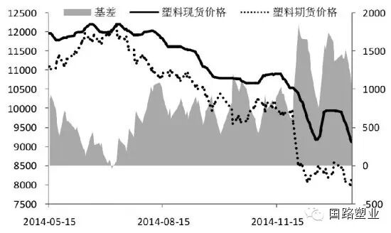 从华东地区市场价格来看,1月13日LLDPE现货价格为9100元/吨,而截至1月15日,现货价格已经涨至9450元/吨,涨幅达3.85%。而塑料期货1503合约价格仅为8470元/吨,期现价差为1000元/吨。目前塑料库存处于相对低位,加之春节临近,下游企业进入补库存期,塑料现货将会进入阶段性的紧俏期,这会引起生产企业的挺价,因此短期内塑料现货价格仍会继续上涨,这为期货价格的上涨提供了动能。