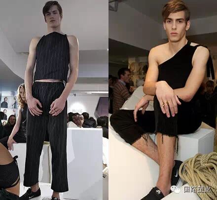 Fashion East展出的解构的细条纹布料套装,包含了无袖上衣和短裤,配上耐克运动鞋。