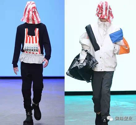 这名年轻的利物浦设计师让他的多名男模走上T台,整个头部和脸部都戴着街角小卖部里的塑料袋。这个震惊四座的配件经时装展的合作设计师——朱迪·布莱恩之手,还可以很欢寻的变成漂亮的领带或是珠宝饰物。