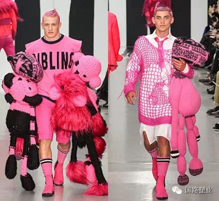 2015秋冬时装展,Sipling打造的是粉色和带火绒的套装——都由糖果色纱线织成的条纹套头衫和围巾,袜子,还有带条纹的动物玩偶。