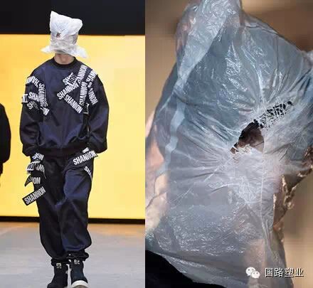 他2015秋冬季的潮流打扮之一就是上面贴满名称标签的运动服,头上顶个白色购物袋。